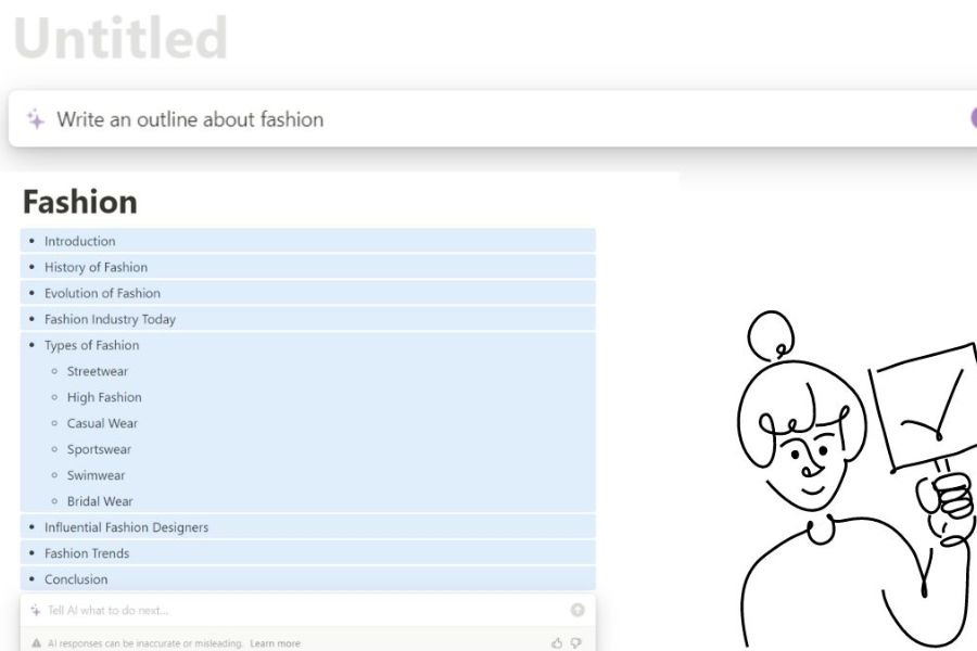 Notion AI giúp bạn tạo dàn ý (Outline) rõ ràng và khoa học chỉ với vài từ khóa mô tả. Công cụ này có khả năng phân tích ngữ cảnh, hiểu mục tiêu của người dùng để gợi ý cấu trúc nội dung phù hợp.