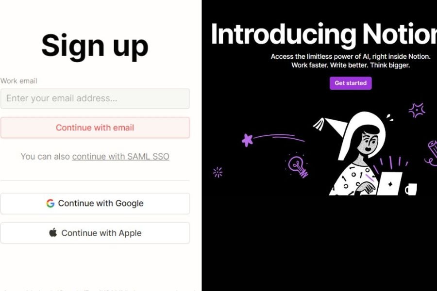Tại đây, bạn có thể đăng ký tài khoản miễn phí bằng email cá nhân hoặc đăng nhập nhanh qua tài khoản Google, Apple. Quá trình đăng ký chỉ mất chưa tới một phút. Sau khi hoàn tất, bạn hãy mở thêm trang kích hoạt tính năng AI tại https://www.notion.so/product/