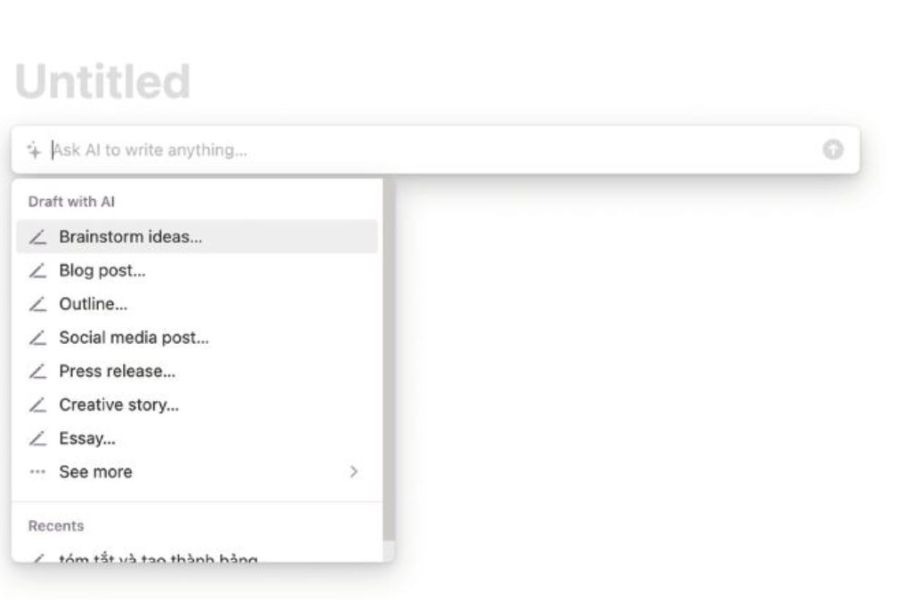 Sau khi kích hoạt thành công, bạn có thể truy cập toàn bộ danh mục tính năng của Notion AI ngay trong thanh menu. Hãy thử bắt đầu với các lựa chọn như “Brainstorm ideas”, “Summarize text”, hay “Improve writing” để cảm nhận khả năng xử lý ngôn ngữ linh hoạt của AI.