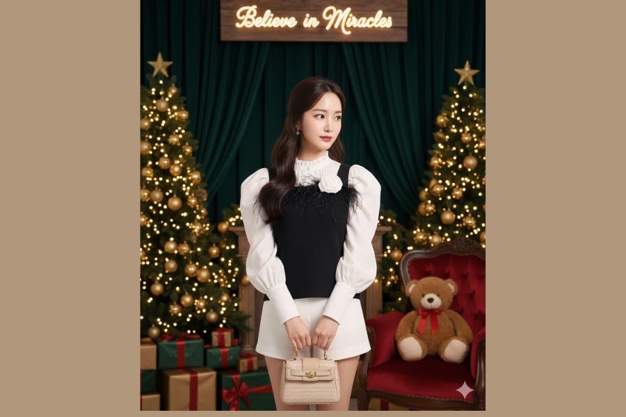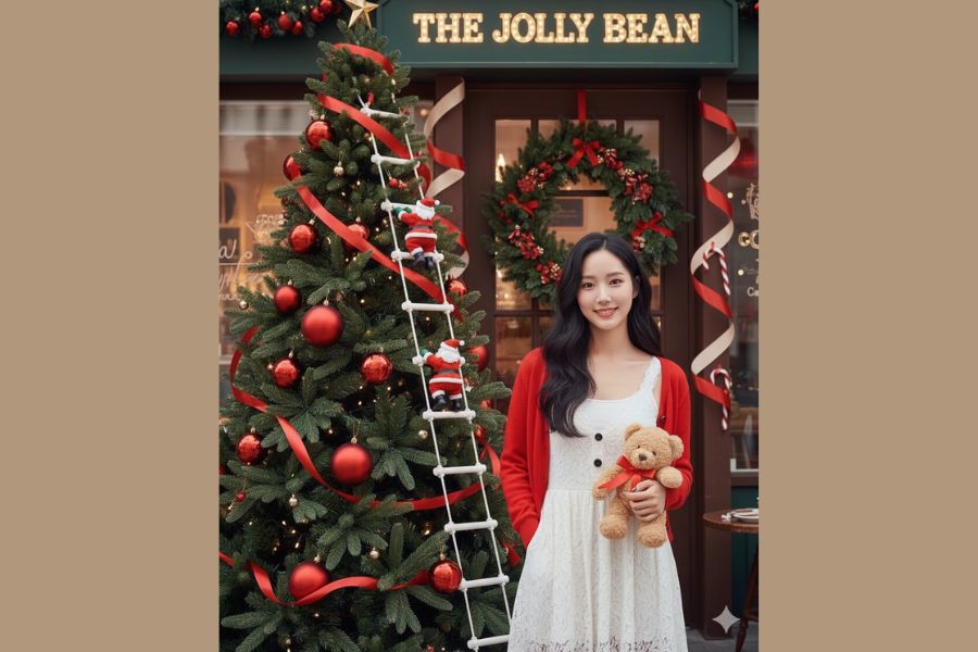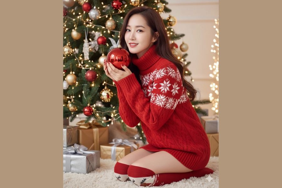 Câu lệnh này phù hợp với những ai yêu thích phong cách Noel hiện đại, năng động nhưng vẫn giữ được nét nữ tính và thời trang. Điểm mạnh của prompt nằm ở sự kết hợp giữa outfit casual chic và không gian Giáng sinh được trang trí rực rỡ, tạo cảm giác rất “đời” nhưng vẫn đủ nổi bật để trở thành một bức ảnh editorial mùa lễ hội.