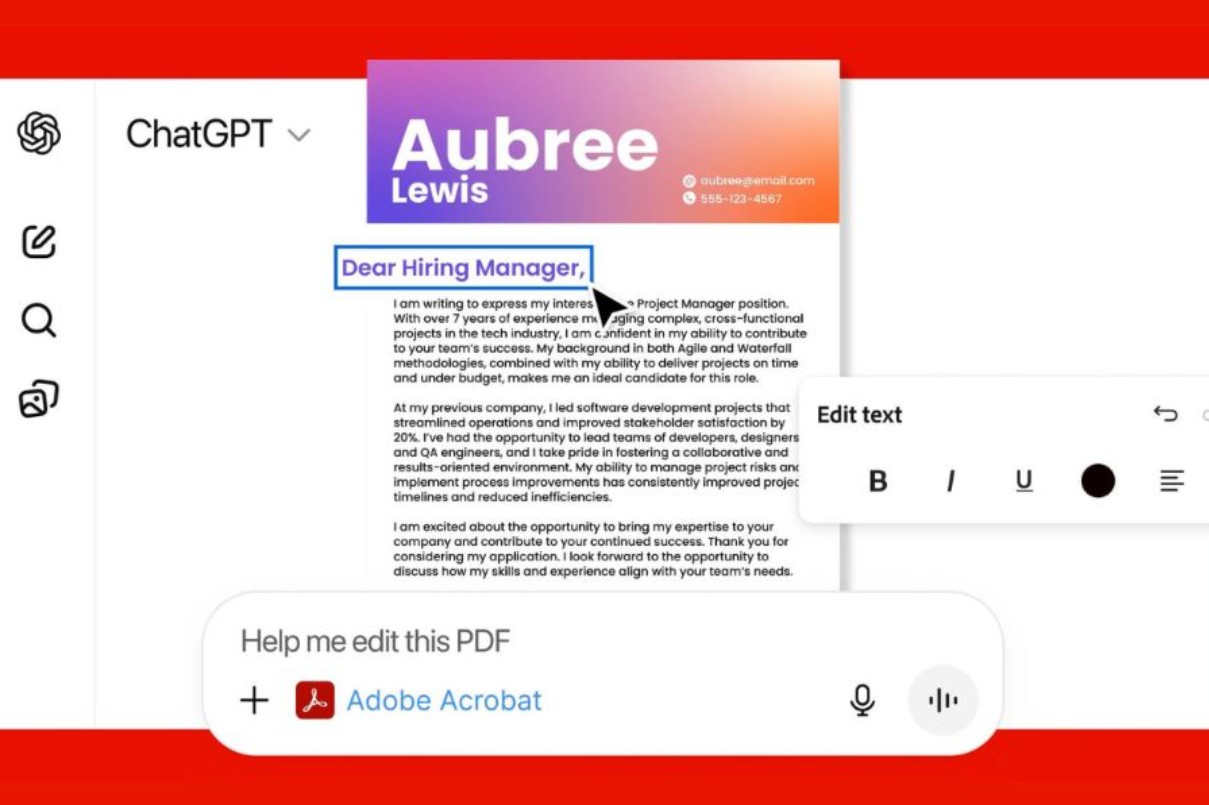 Acrobat là mảnh ghép quan trọng trong bản tích hợp này, bởi tài liệu PDF vẫn là định dạng phổ biến trong môi trường doanh nghiệp, giáo dục và hành chính. Thông qua ChatGPT, người dùng có thể yêu cầu AI chỉnh sửa nội dung PDF, trích xuất văn bản hoặc bảng biểu, sắp xếp lại trang, hợp nhất nhiều tệp, nén dung lượng hoặc chuyển đổi sang các định dạng khác.