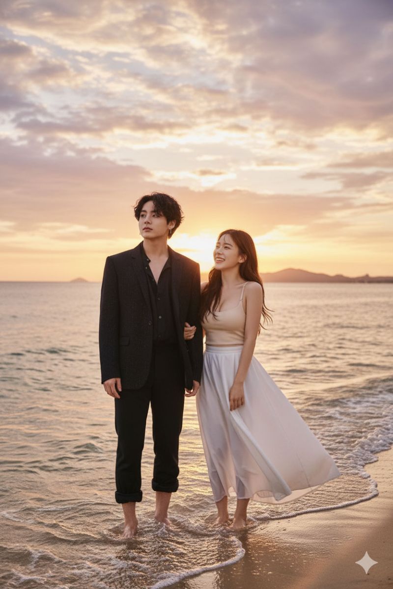 "Combine two photos into one seamless image. Keep faces and clothing unchanged. The idol and the fan stand barefoot on the beach at sunset, soft waves touching their feet. The scene is cinematic, romantic, and calm. Vertical 9:16, warm light, 8K detail.",