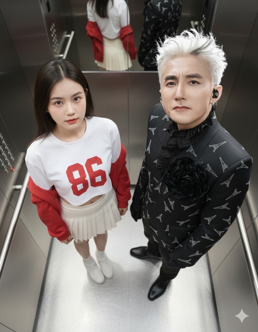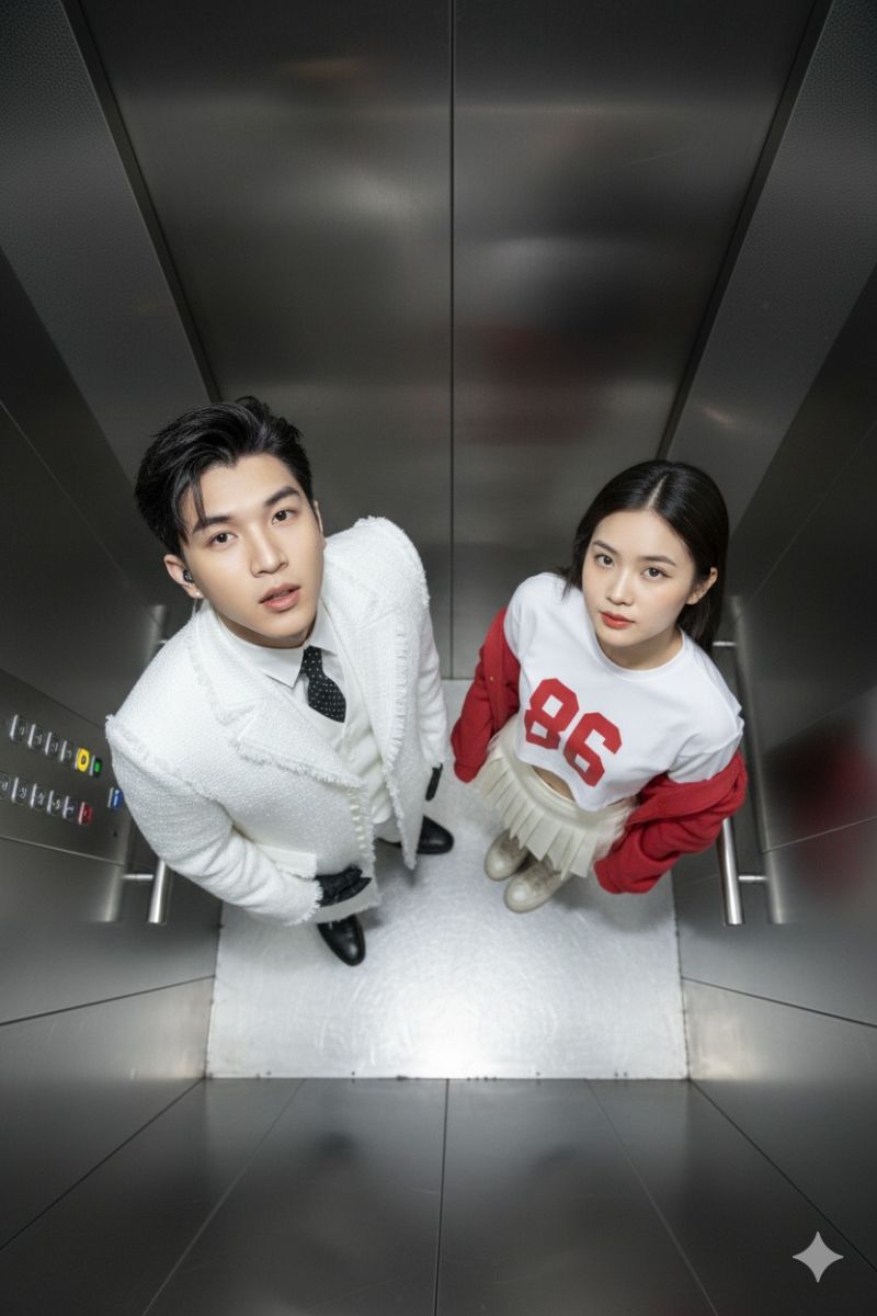 "Combine two photos into one seamless image. Keep the original faces and clothing unchanged, ensuring the facial details look realistic and authentic. The scene should resemble a photo booth style picture taken from above, giving the impression of a narrow, confined space inside an elevator. The young man and the other character stand next to each other, both looking upward directly at the camera. Their feet are touching the elevator floor, and the background clearly shows the interior of the elevator cabin. The composition should be vertical with a 9:16 aspect ratio, cinematic lighting, bright tones, and ultra-clear 8K resolution.",
