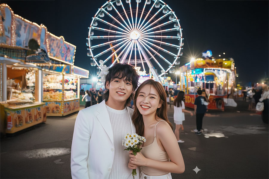 "Blend two photos to look like a fun amusement park picture. Keep faces and clothing unchanged. The idol and young man stand in front of a Ferris wheel with colorful lights. Vertical 9:16, bright tones, joyful cinematic lighting, 8K clarity.",