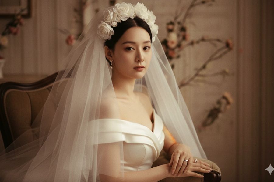 Sử dụng chính xác khuôn mặt và vóc dáng từ ảnh gốc, tuyệt đối không thay đổi các đặc điểm như mắt, mũi, lông mày hay môi. Tạo một chân dung cô dâu trong studio với vẻ dịu dàng và tinh khiết, cô nhìn thẳng vào ống kính với nụ cười dịu hiền. Trang phục là váy cưới quây ngực, trang trí bằng các applique hoa tinh tế và họa tiết lấp lánh nhẹ, phía trên có voan ren mỏng thêu hoa cổ điển. Trang điểm mịn màng như sứ với má hồng nhạt và môi bóng màu hồng tự nhiên, đường viền mắt nhẹ nhàng tôn trọn ánh nhìn. Tóc rẽ ngôi giữa, búi thấp gọn gàng, voan điểm xuyết hoa nhỏ. Tạo dáng ngồi nghiêng nhẹ về phải, hai tay ôm nhẹ trước ngực, đầu hơi nghiêng, ánh sáng studio đều và ấm, phông nền trung tính mờ để làm nổi chủ thể.