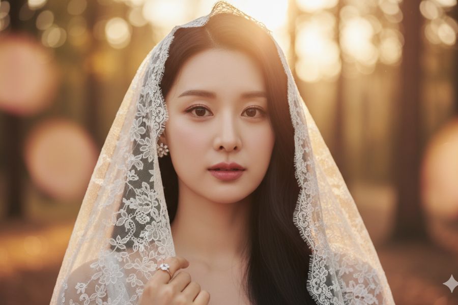 Giữ nguyên hoàn toàn khuôn mặt và các đường nét, không thay đổi đặc điểm nhận diện. Tạo một ảnh cận mặt mơ mộng, cô đội một tấm voan ren màu ngà che nhẹ phần khuôn mặt tạo vẻ huyền ảo. Làn da được trang điểm nhẹ, óng ả và rạng rỡ, nhấn vào hiệu ứng glow tự nhiên. Phông nền là khu vườn hoặc rừng với ánh hoàng hôn vàng ruộm, hiệu ứng bokeh mịn khiến hậu cảnh mơ màng. Ghi chú kỹ thuật: giả lập ống kính 85mm, khẩu độ nông, phong cách điện ảnh lãng mạn để tạo độ sâu trường ảnh mỏng và cảm giác thơ mộng.
