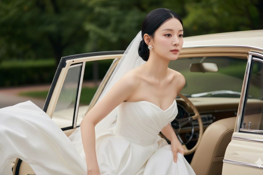 Giữ nguyên 100% khuôn mặt và vóc dáng từ ảnh tham chiếu. Tạo khung cảnh cô dâu thanh lịch đang bước ra khỏi một chiếc xe cổ màu kem. Váy cưới quây trang nhã, chất liệu nhẹ nhàng tạo sóng khi cô khum người bước ra, voan mỏng phủ nhẹ mái tóc. Trang điểm tông nhạt, da sáng mịn với má hồng tự nhiên và môi hồng nhẹ nhàng. Tóc búi thấp bóng mượt với vài lọn rủ nhẹ. Cô đeo khuyên ngọc trai cổ điển, ánh mắt quay đi tạo vẻ lãng mạn. Khung cảnh xung quanh có nội thất xe da beige và cây cỏ xanh tươi bên ngoài, ánh sáng tự nhiên ấm áp chiếu vào, tổng thể sang trọng, cổ điển và lãng mạn.
