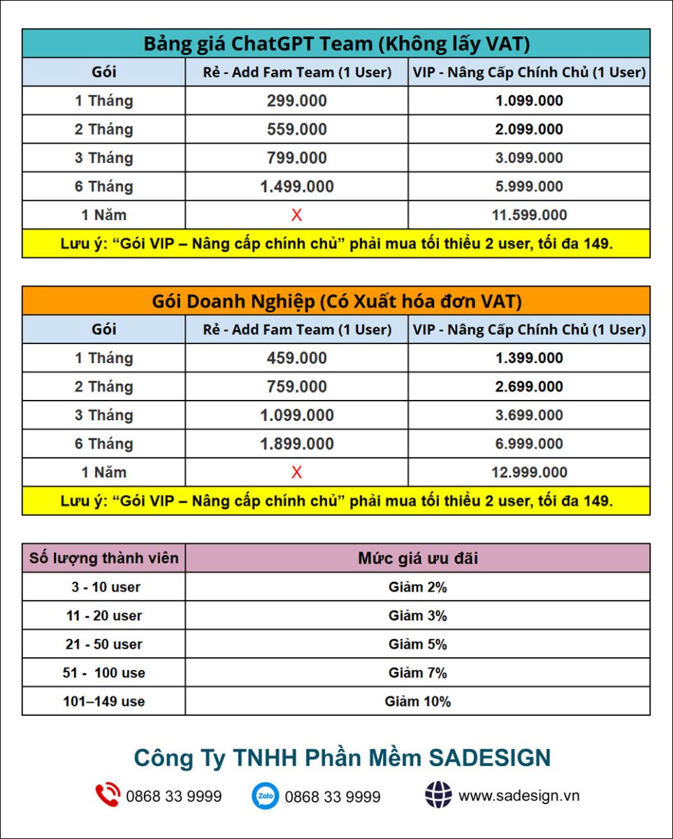 Bảng Giá ChatGPT Team tại Công Ty TNHH SADESIGN
