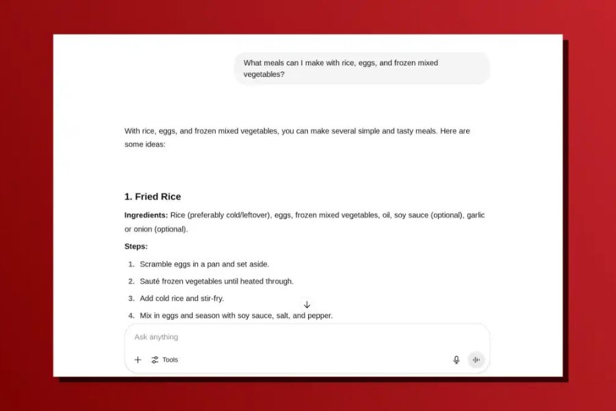Sau một ngày làm việc dài, việc đứng bếp đôi khi trở thành “nhiệm vụ bất khả thi”, nhất là khi tủ lạnh chỉ còn vài nguyên liệu lặt vặt. Thay vì loay hoay không biết nấu gì, bạn có thể mở ChatGPT và hỏi ngay: “Tôi có cơm nguội, vài quả trứng và ít rau củ, nấu được món gì ngon?” Chỉ trong vài giây, ChatGPT sẽ biến danh sách nguyên liệu tưởng chừng đơn giản ấy thành thực đơn hấp dẫn nào là cơm chiên trứng kiểu Nhật, trứng hấp rau củ mềm +-mịn, hay bánh cơm trứng nướng giòn rụm.
