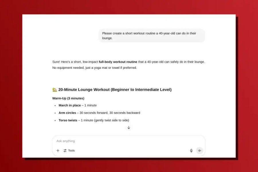 Điều tuyệt vời hơn là ChatGPT có thể đóng vai “huấn luyện viên riêng” cho nhiều hoàn cảnh: người trung niên muốn giãn cơ, dân văn phòng cần bài tập nhẹ trong giờ nghỉ trưa, hay người đang hồi phục sau chấn thương. Mỗi kế hoạch tập luyện đều được sắp xếp khoa học, cân đối giữa thời lượng, cường độ và khả năng của cơ thể. Chỉ với vài dòng lệnh, bạn đã có một “PT ảo” luôn sẵn sàng đồng hành, giúp duy trì sức khỏe và năng lượng mỗi ngày mà không tốn một đồng phí nào.