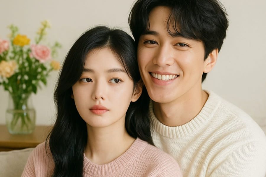 Maintain the same facial expressions as in the provided image. Generate a tender, romantic portrait of a couple sitting together on a sofa. The woman wears a pastel pink knitted sweater, her long, wavy black hair cascading gently over her shoulders, with a serene and dreamy expression. The man, dressed in an ivory-white knit sweater, embraces her affectionately and smiles with genuine warmth. In the background, place a vase filled with vibrant flowers on a nearby table, along with soft, cozy home décor. Use natural, diffused daylight to create a bright, warm, and intimate atmosphere, resembling a professional lifestyle studio photoshoot. Emphasize realistic skin texture, natural fabric details, and soft shadows.