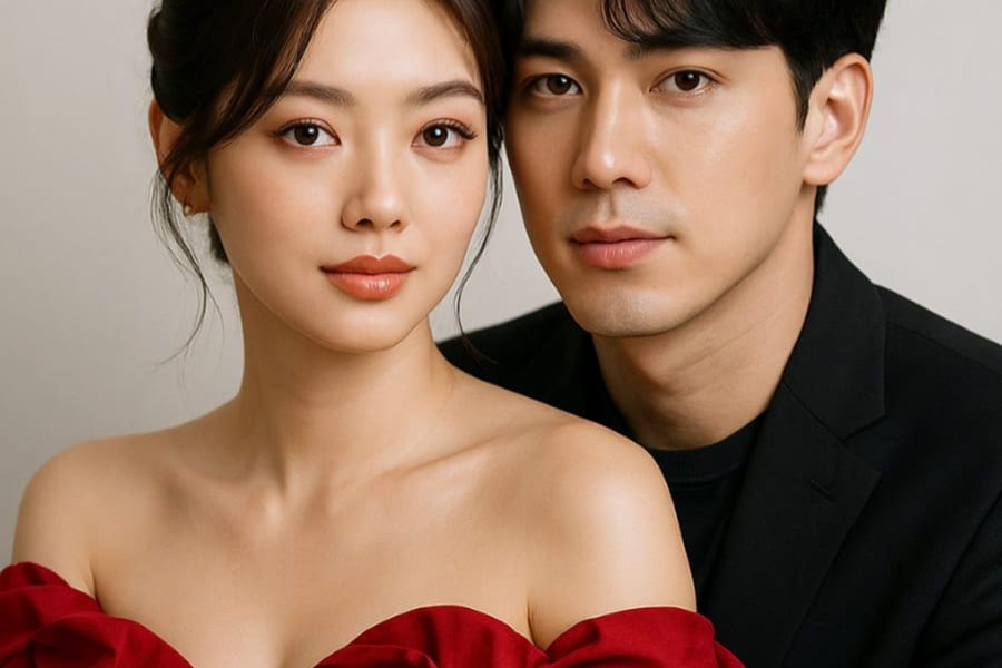 Retain the exact facial expressions from the provided image and generate an ultra-high-resolution, photorealistic three-quarter portrait of a fashionable couple in an intimate pose. Use the uploaded image as the primary reference for facial features, pose, hair, and outfits. The composition should be waist-up, with the woman seated slightly forward and leaning gently back into the man’s supportive arm, their faces close together and softly angled toward the camera. The woman wears a glamorous off-shoulder red gown with ruffled detailing and a rose accent on the bodice, elegant rings, manicured nails, and refined bridal makeup; her hair styled in an updo with delicate loose strands. The man wears a tailored black blazer over a dark shirt, with neatly styled short black hair and a calm, protective expression. Use a softly textured white or light-gray studio background with balanced key light, subtle rim light, and visible eye catchlights. Capture in an 85mm portrait style with shallow depth of field (f/1.8–2.0). Emphasize natural skin texture, realistic fabric folds, true jewelry reflections, and a warm-neutral cinematic color grade. No text or watermark.