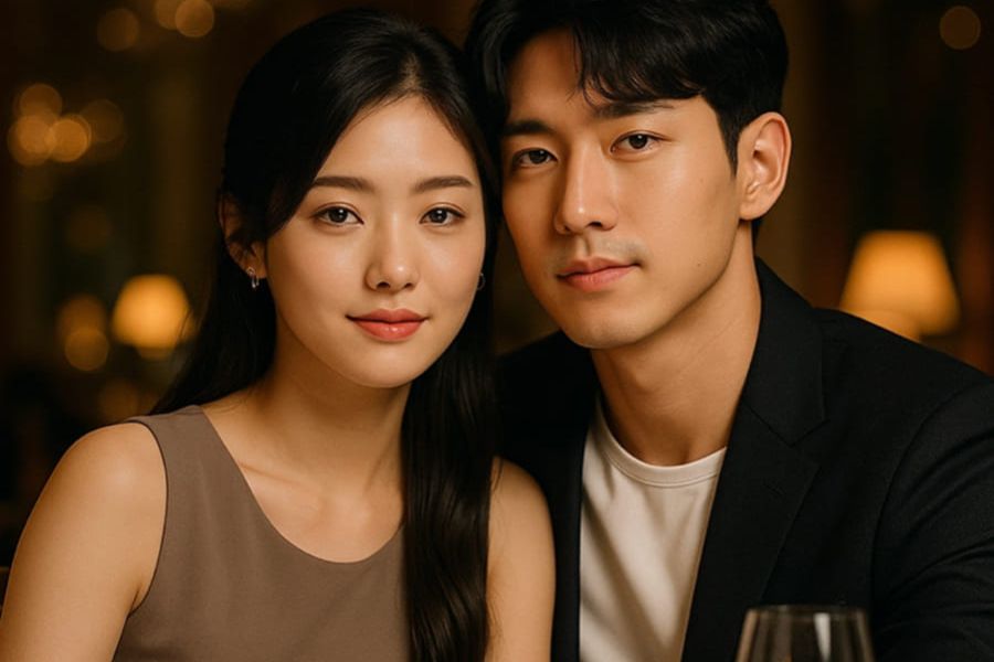 Create a high-resolution, photorealistic cinematic portrait of an elegant young couple dining together in a cozy, upscale restaurant. They sit close at a white-linen table set with plates, cutlery, wine glasses, and subtle table décor. The softly blurred background features glowing chandeliers and warm table lamps, creating an intimate golden ambiance. The man wears a tailored dark brown or navy suit jacket over a crisp white shirt, appearing relaxed and confident. The woman wears a sleeveless neutral-toned evening gown, with long dark hair flowing naturally, soft makeup, and delicate earrings. Frame the image chest-up, both faces gently turned toward the camera with affectionate expressions. Use warm, diffused lighting with subtle rim light and clear eye catchlights. Apply an 85mm portrait look with shallow depth of field (f/1.8–2.0), highlighting lifelike skin texture, natural fabric detail, realistic glass reflections, and a cinematic warm color tone with gentle contrast. Keep proportions natural and avoid over-retouching.