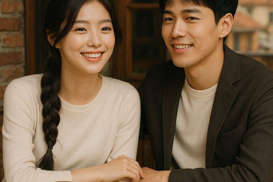 Preserve the exact facial expressions and faces from the uploaded reference photo. Create a cozy, high-resolution lifestyle portrait of a young couple in a vintage café or on a rooftop terrace. They wear casual white and beige outfits, sharing a natural, joyful moment as they smile and talk together. On the table, include nostalgic details such as cups of coffee, an open book, and a vintage film camera to enhance the retro mood. Use soft, golden lighting to evoke a warm, romantic everyday atmosphere. The background should feature rustic wooden décor or a softly blurred rooftop cityscape for depth and intimacy. The overall tone should feel authentic, cinematic, and emotionally expressive, inspired by ultra-realistic Korean lifestyle couple photography.