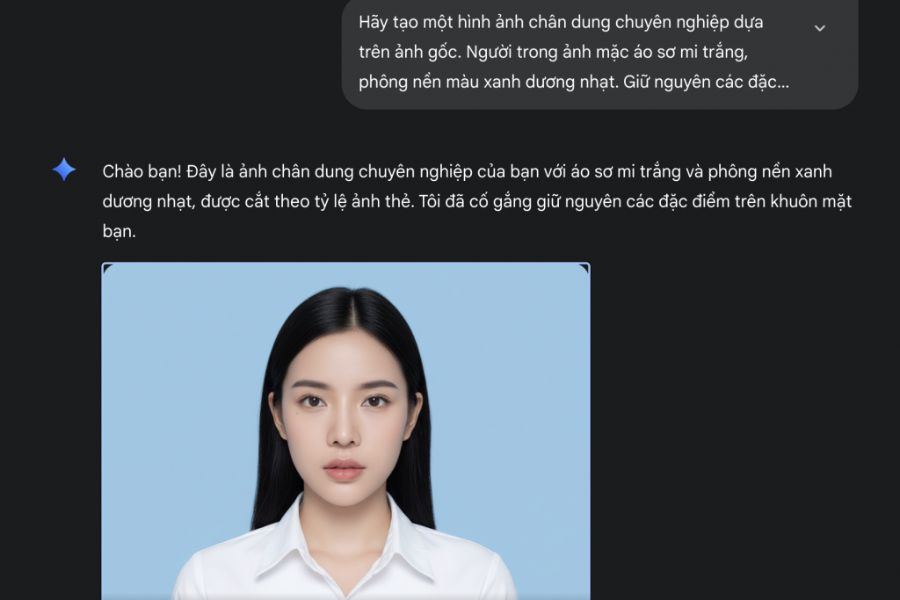 Ví dụ, với nam có thể yêu cầu mặc áo sơ mi trắng, vest đen, nền xanh dương, biểu cảm nghiêm túc. Với nữ có thể chọn áo sơ mi trắng, tóc gọn gàng, nền trắng, gương mặt tươi tắn. Chỉ với vài dòng mô tả đơn giản, Gemini đã có thể “hình dung” và xử lý ảnh theo đúng tiêu chuẩn ảnh thẻ chuyên nghiệp.