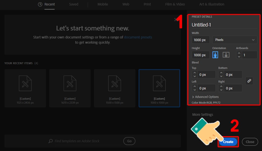 Sau khi chọn New, bạn nhập các thông số cụ thể về chiều rộng, chiều cao và các tùy chọn khác như Orientation (Portrait hoặc Landscape) và Color Mode (RGB hoặc CMYK). Nhấn Create để mở Artboard mới. Bước này giúp bạn có một không gian thiết kế chuẩn, tối ưu hóa cho việc tạo bảng và các yếu tố đồ họa khác sau này.