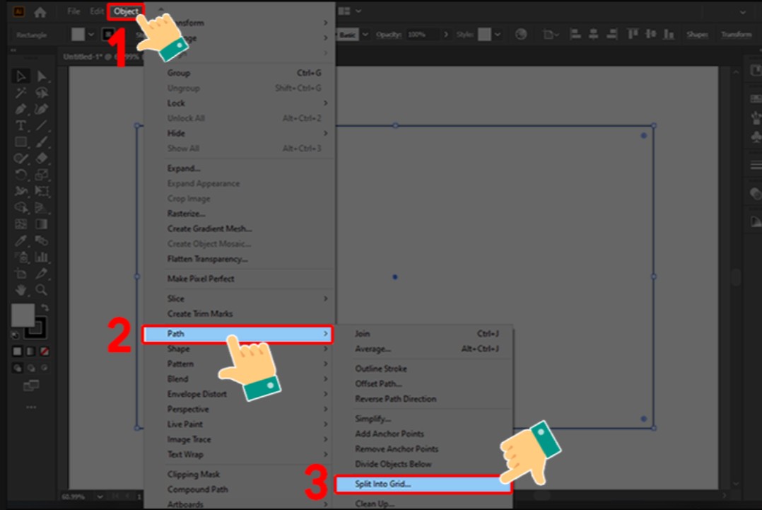 Vào menu Object > Path > Split Into Grid, Illustrator sẽ hiển thị hộp thoại chia lưới. Tại đây, bạn có thể xác định số lượng Rows (hàng) và Columns (cột) cũng như khoảng cách giữa các ô. Tính năng này cho phép bạn chia bảng một cách chính xác và đồng đều, giúp bảng trông chuyên nghiệp và dễ đọc.