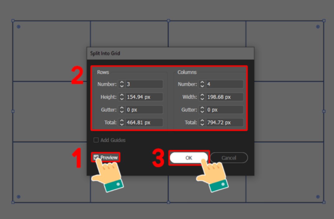 Tick vào ô Preview để xem trước kết quả chia lưới. Bạn có thể điều chỉnh số lượng hàng, cột hoặc khoảng cách giữa các ô cho phù hợp với nhu cầu thiết kế. Khi đã hài lòng với kết quả, nhấn OK để xác nhận. Bước này giúp bạn kiểm tra bố cục trước khi tiến hành chỉnh màu và chi tiết các ô.