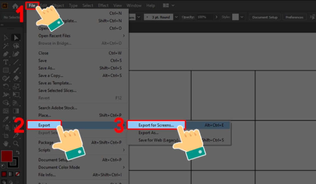 Chọn File > Export > Export for Screens để bắt đầu lưu bảng thiết kế. Công cụ này giúp xuất bảng với nhiều định dạng khác nhau, chuẩn web hoặc in ấn, đồng thời giữ nguyên chất lượng vector và màu sắc. Bạn có thể chọn xuất từng Artboard hoặc toàn bộ thiết kế nếu tạo nhiều bảng trong cùng một file.