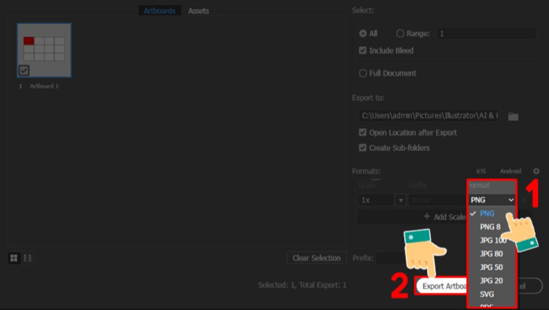 Trong mục Format, chọn định dạng file mong muốn như PNG, JPG, PDF, SVG,… Sau đó nhấn Export Artboard để hoàn tất quá trình lưu bảng. Bước này quyết định chất lượng hiển thị và in ấn của bảng, đồng thời giúp bạn chia sẻ hoặc sử dụng bảng trong các dự án khác một cách dễ dàng.