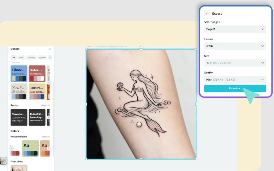 Khi đã chọn được thiết kế ưng ý, bạn có thể tải xuống với độ phân giải cao. File này có thể được sử dụng để chia sẻ trên mạng xã hội, lưu trữ hoặc mang trực tiếp đến studio xăm hình làm tài liệu tham khảo. Nhờ chất lượng hình ảnh cao, nghệ sĩ xăm có thể dễ dàng tái hiện lại thiết kế một cách chính xác.