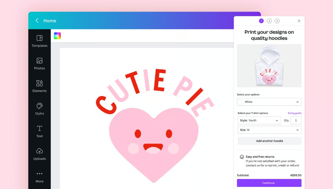 Công cụ thiết kế áo hoodie của Canva cho phép bạn bắt đầu chỉ với vài cú nhấp chuột. Giao diện trực quan, dễ sử dụng giúp bạn nhanh chóng làm quen và thao tác mượt mà ngay từ lần đầu trải nghiệm. Từ việc lên ý tưởng, chọn mẫu, chỉnh sửa đến xuất file hoặc đặt in – tất cả đều được tích hợp trong một nền tảng duy nhất.
