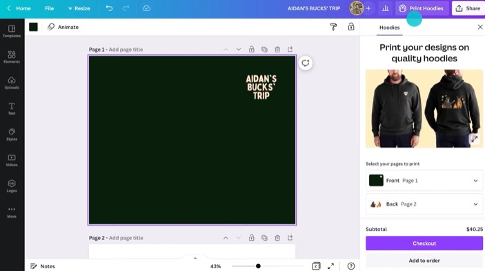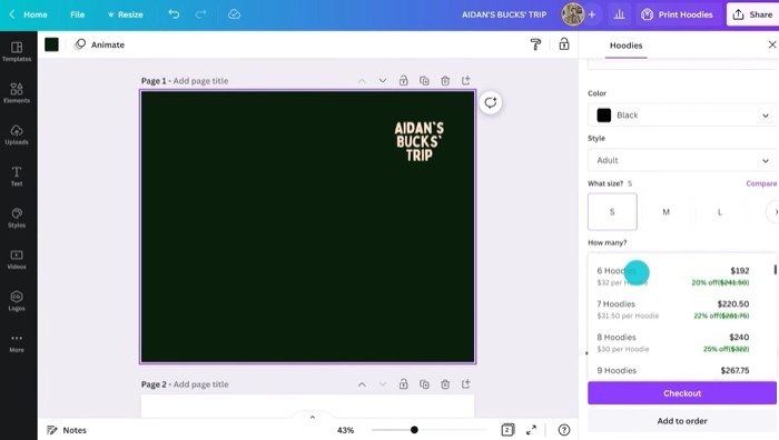 Khi đã sẵn sàng, bạn chỉ cần nhấp vào nút “In” trên giao diện Canva. Tại đây, bạn có thể chọn số lượng, kích thước và màu sắc áo hoodie.
