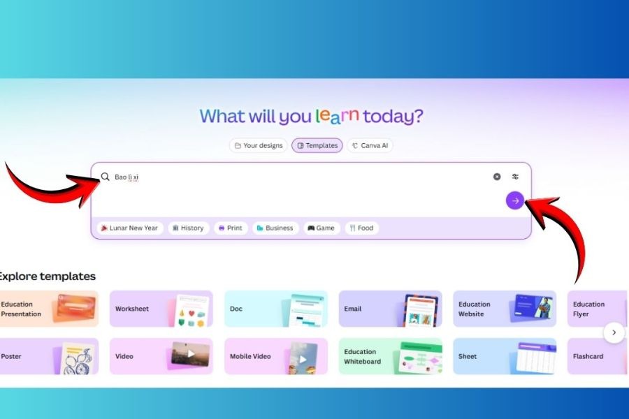 Truy cập Canva và chọn mục Templates trên thanh công cụ chính. Tại ô tìm kiếm, nhập các từ khóa như “Bao lì xì”, “Lunar New Year envelope” hoặc “Red envelope”. Chỉ trong vài giây, Canva sẽ hiển thị hàng trăm mẫu thiết kế với nhiều phong cách khác nhau, từ truyền thống với sắc đỏ vàng đến các mẫu hiện đại, tối giản hoặc dễ thương.