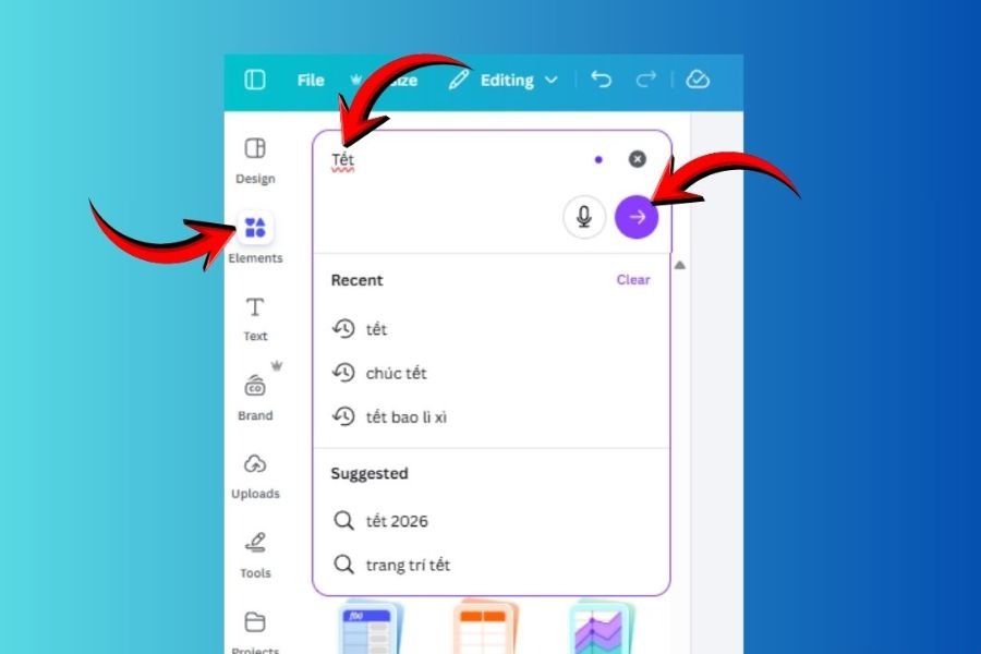 Để bao lì xì trở nên sinh động và mang đậm không khí Tết, bạn hãy chọn tab Elements ở thanh bên trái. Sau đó, nhập các từ khóa như “tết”, “hoa mai”, “đèn lồng”, “zodiac”, “lunar new year” hoặc tên linh vật của năm.