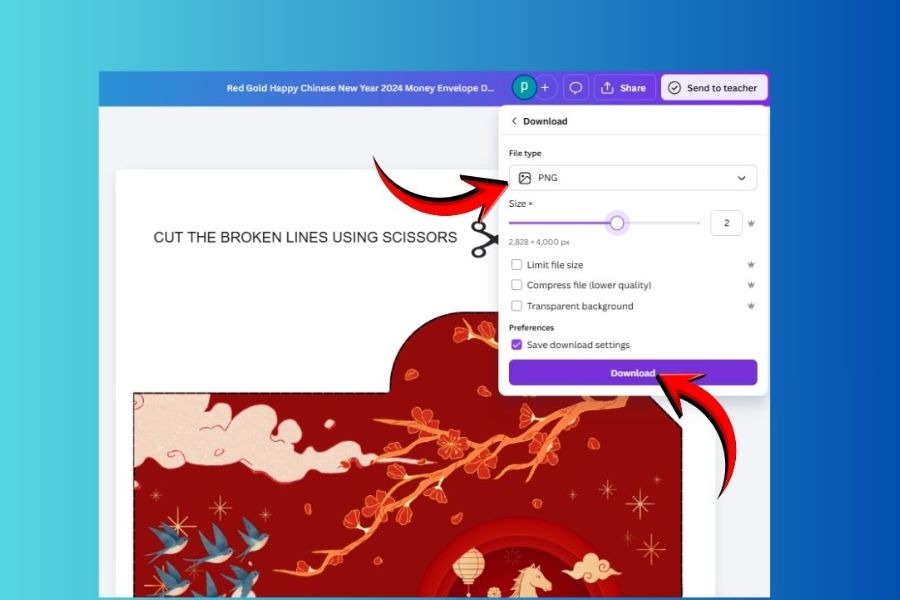 Sau khi chọn định dạng, nhấn Download để tải file về máy. Lúc này, mẫu bao lì xì của bạn đã sẵn sàng để in hoặc sử dụng ngay, với thiết kế mang đậm dấu ấn cá nhân hoặc thương hiệu.
