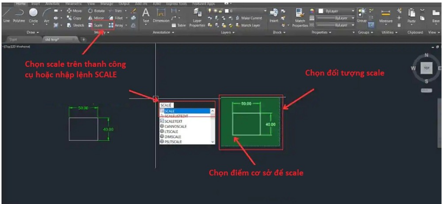 Bước 1: Gõ lệnh SCALE → Chọn đối tượng cần phóng to hoặc thu nhỏ.