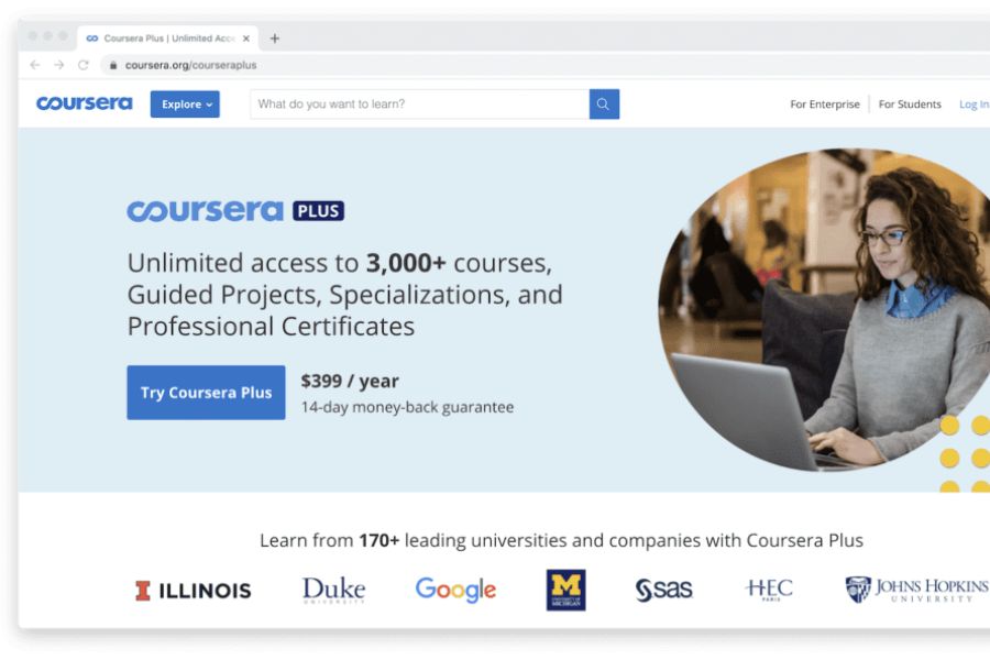 Sadesign là địa chỉ uy tín giúp bạn nâng cấp Coursera Plus với mức giá ưu đãi, tiết kiệm chi phí tối đa nhưng vẫn đảm bảo trải nghiệm học tập trọn vẹn. Với gói Coursera Plus, bạn có thể truy cập không giới hạn hàng nghìn khóa học, chuyên ngành và chương trình chứng chỉ từ các trường đại học và tổ chức danh tiếng trên toàn cầu, giúp quá trình học tập trở nên linh hoạt và hiệu quả hơn.
