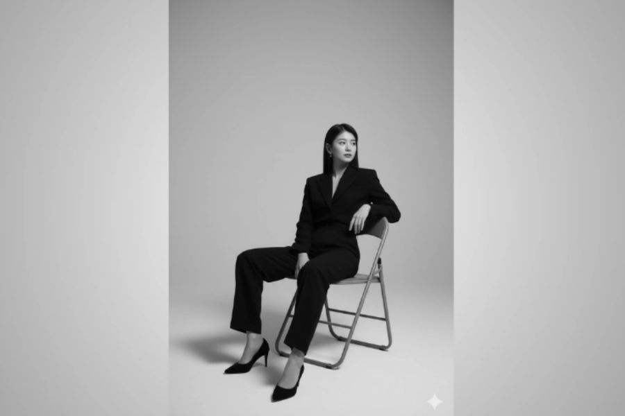 “Black-and-white studio portrait, keep the real face completely unchanged. Subject sits relaxed on a metal folding chair, legs crossed, slightly leaning with one hand resting on the chair back and head turned gently to the side. Outfit: all-black minimalist style (blazer with trousers or skirt), matching black shoes. Camera angle: medium full-body shot, taken slightly from the front-right corner (about 30 - 45 degrees), not straight-on, leaving generous negative space above and around the subject. Soft, minimal lighting creates clear shadows and a subtle moody atmosphere. Plain monochrome background, clean and modern aesthetic.”
