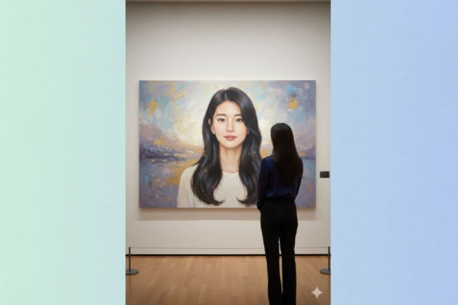 “Biến ảnh này thành khung cảnh trong phòng triển lãm nghệ thuật. Trên tường treo một bức tranh chân dung sơn dầu khổ lớn vẽ lại chính nhân vật trong ảnh, theo phong cách hội họa đương đại với nét cọ mềm mại, nền trừu tượng và mơ mộng. Chân dung phải giữ nguyên gương mặt thật, đường nét và danh tính, không được biến dạng hay thay đổi. Ở tiền cảnh, hiển thị chính nhân vật đó nhìn từ phía sau, nhưng đứng hơi lệch sang một bên và hơi chếch góc, để toàn bộ bức tranh trên tường được nhìn rõ ràng, không bị che khuất. Toàn cảnh phải sắc nét, chi tiết, rõ ràng, mang không khí tinh tế và nghệ thuật.”