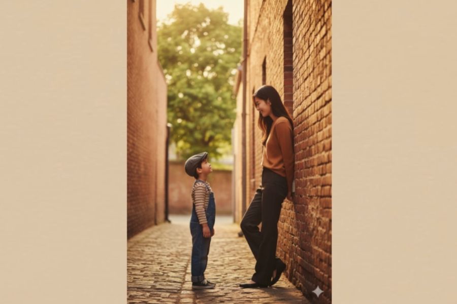 “Người trong ảnh tôi cung cấp và một cậu bé đứng trong một con hẻm cũ kỹ, nhìn nhau. Người trong ảnh đang dựa vào bức tường gạch, còn cậu bé đội mũ đang nhìn lên người trong ảnh. Khung cảnh ngập tràn ánh nắng ấm áp của hoàng hôn, làm nổi bật những bức tường gạch cũ và một cái cây xanh ở phía sau. Phong cách ảnh chân thực với tông màu hoài cổ, ấm áp. Prompt này tập trung vào bối cảnh, ánh sáng và cảm xúc, giúp bạn dễ dàng áp dụng cho các trang phục và nhân vật khác nhau mà vẫn giữ được không khí tương tự bức ảnh gốc.”