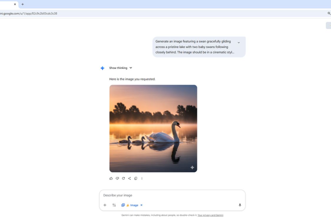 Ví dụ, bạn có thể thử tạo cảnh một chú thiên nga lướt nhẹ trên mặt hồ cùng hai chú thiên nga con. Chỉ sau vài giây, bạn sẽ thấy ý tưởng của mình được hiện thực hóa thành hình ảnh trực quan và sinh động. Việc này không chỉ giúp bạn khám phá khả năng sáng tạo mà còn làm quen với cách thức hoạt động của Nano Banana một cách dễ dàng và trực quan.