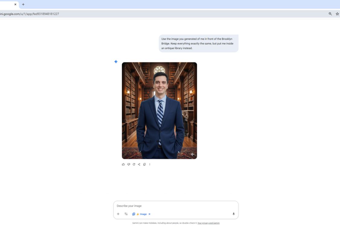 Ví dụ, bạn có thể sử dụng câu lệnh: “Sử dụng hình ảnh tôi đứng trước Cầu Brooklyn, giữ mọi thứ nguyên vẹn nhưng đặt tôi vào bên trong một thư viện cổ điển.” Nano Banana sẽ tự động điều chỉnh ánh sáng, màu sắc và chi tiết nền, tạo ra một bức ảnh hoàn toàn mới mà vẫn trung thực với hình ảnh gốc. Tính năng này giúp bạn biến những bức ảnh đơn giản thành những tác phẩm sáng tạo độc đáo chỉ trong vài giây.
