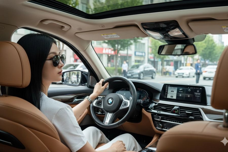 Ví dụ: “Ultra-realistic cinematic photo of (the person from the reference photo) sitting in the driver’s seat of a luxury BMW, the driver sitting on the left side, viewed from behind the shoulder… modern interior, leather seats, panoramic sunroof, natural daylight…”