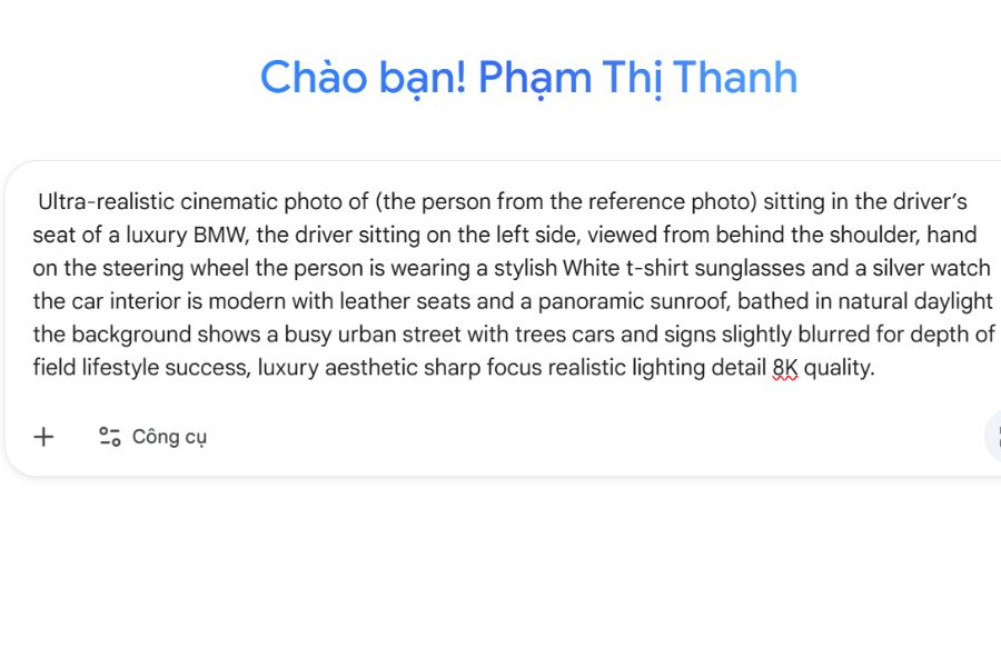 Câu lệnh bạn nhập cho Gemini quyết định phong cách, góc chụp và cảm xúc của bức ảnh “ngồi BMW”, vì vậy hãy viết prompt rõ ràng, cụ thể và giàu chi tiết. Ghi rõ loại xe BMW, vật liệu nội thất như ghế da, vô lăng, cửa sổ trời, cùng góc nhìn mong muốn và trạng thái người ngồi, ví dụ tay đặt trên vô lăng hay nhìn ra phía cửa sổ. Đừng quên mô tả ánh sáng và không gian xung quanh như ánh hoàng hôn, phố xá mờ phía sau, hoặc phong cách ảnh như cinematic hay lifestyle để AI hiểu tông màu và xử lý độ sâu trường ảnh phù hợp.