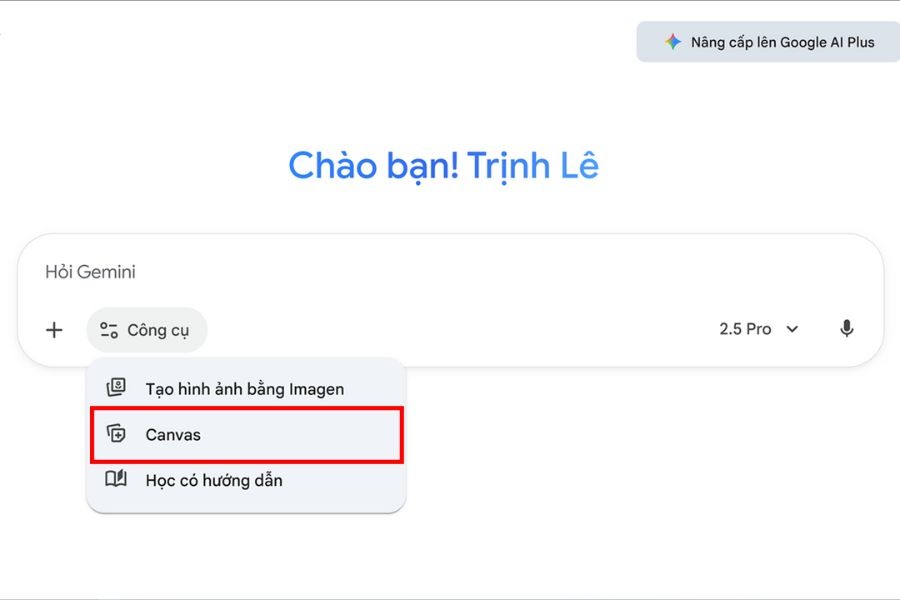 Trước tiên, hãy mở Gemini trên trình duyệt web (hiện tính năng Canvas mới có trên phiên bản web, các bản di động sẽ được cập nhật sau). Trong giao diện chính, bạn sẽ thấy mục Canvas nằm ở thanh công cụ đây là nơi để bạn bắt đầu tạo bài thuyết trình tự động bằng AI.