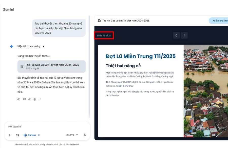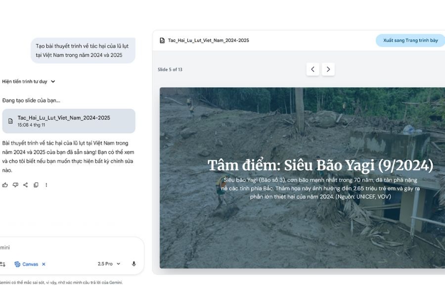 Kiểm tra và chỉnh sửa thủ công: Dù Gemini Canvas đã rất thông minh, bạn vẫn nên xem lại bố cục, số liệu và nội dung chính sau khi hoàn thành. Việc thêm ví dụ, dẫn chứng hoặc hình ảnh thực tế sẽ giúp slide của bạn đáng tin cậy và sinh động hơn.
