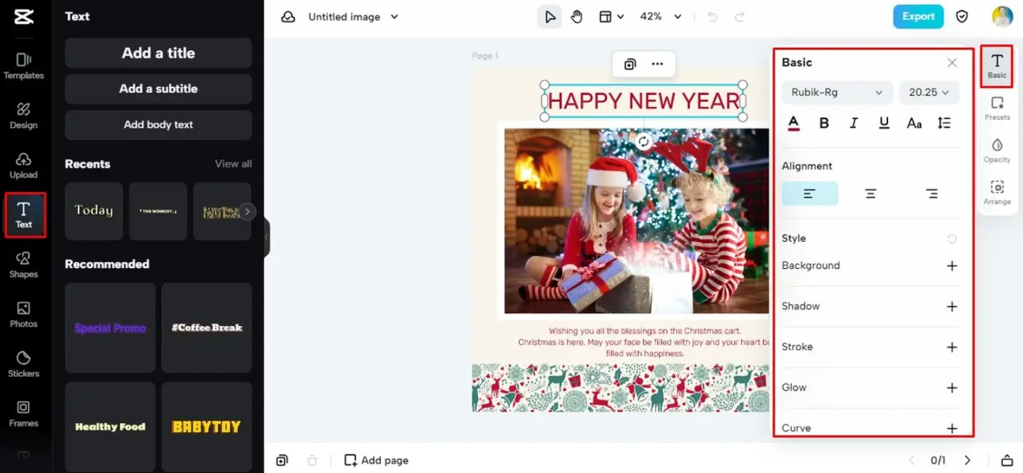 Mỗi dòng chữ nên được đặt đúng vị trí để tổng thể không bị rối. Một lỗi mà nhiều người thường mắc phải là sử dụng quá nhiều phông chữ khác nhau, khiến tấm thiệp thiếu sự thống nhất. CapCut hỗ trợ bạn điều chỉnh màu chữ, thêm bóng đổ hoặc đường viền để giúp văn bản nổi bật hơn trên nền có họa tiết.