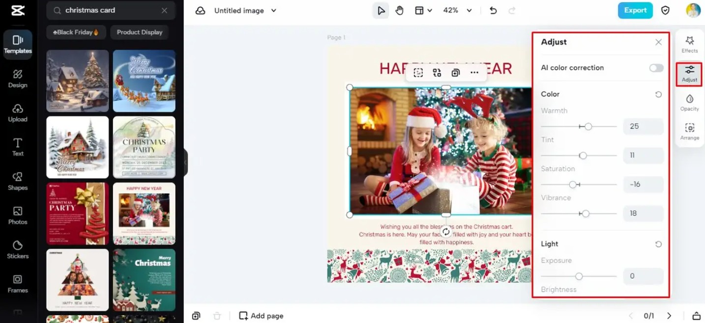 CapCut cho phép điều chỉnh độ sáng, độ tương phản và thêm các lớp hiệu ứng ánh sáng để những bức ảnh hòa hợp hơn với nền thiệp.