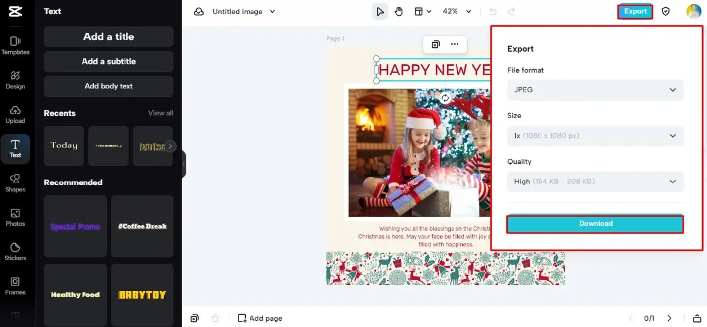 Khi đã hài lòng với thiết kế, bạn chỉ cần nhấn nút “Download”. CapCut cho phép tải miễn phí với chất lượng cao, phù hợp cả khi bạn muốn in ra hoặc gửi trực tuyến.