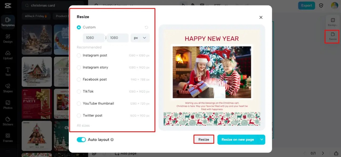 Mỗi nền tảng đều có tỷ lệ hiển thị riêng. Việc điều chỉnh kích thước giúp bạn đảm bảo tấm thiệp xuất hiện đẹp nhất ở nơi bạn muốn đăng tải. Với CapCut, bạn không cần tự tính toán kích thước vì hệ thống đã có sẵn các tùy chọn phổ biến cho từng nền tảng như Facebook, Instagram, TikTok hoặc bản in truyền thống. Điều này giúp quá trình thiết kế trở nên nhanh gọn và chính xác.