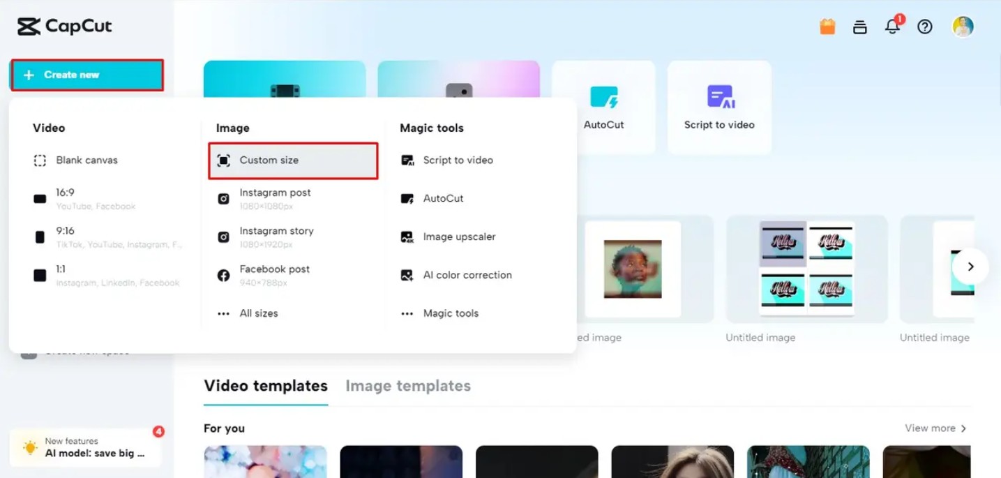 Tại giao diện chính, bạn chọn tính năng tạo thiết kế mới. Đây là bước đặt nền móng cho toàn bộ quá trình, đồng thời cho phép bạn tùy chỉnh kích thước theo nhu cầu. Tùy thuộc mục đích sử dụng: gửi online, đăng mạng xã hội hoặc in ấn, bạn có thể chọn tỉ lệ phù hợp ngay từ đầu.