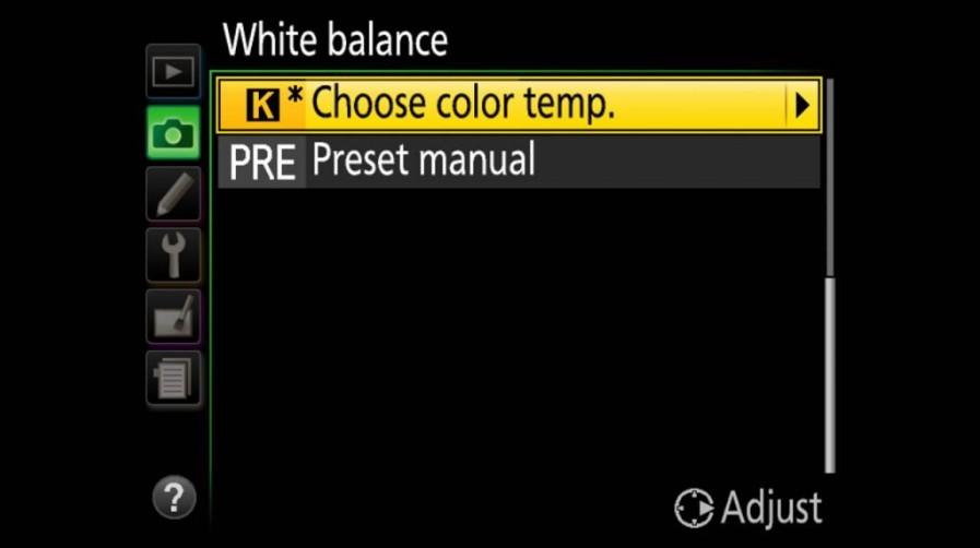 Trong trường hợp máy ảnh không có nút WB riêng, người dùng có thể truy cập vào menu Shooting và tìm mục White Balance để thiết lập phù hợp với điều kiện ánh sáng.