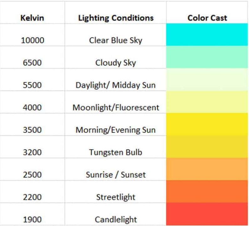 Thông thường, ánh sáng mà mắt người cảm nhận là trung tính nằm ở mức khoảng 5.500K. Đây được xem là tiêu chuẩn ánh sáng ban ngày và thường được sử dụng làm mốc tham chiếu trong nhiếp ảnh và điện ảnh.
