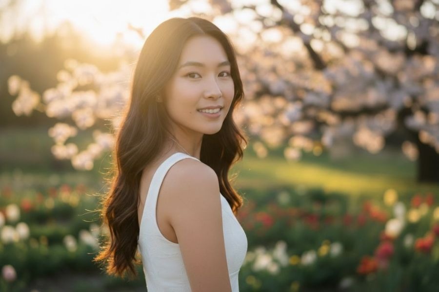 Prompt 3: Tạo avatar 8/3 dựa trên gương mặt gốc được cung cấp, giữ nguyên toàn bộ đặc điểm nhận diện và thần thái thật. Góc chụp trung cảnh, nhân vật quay lưng nhẹ, đầu ngoái lại nhìn camera, ánh mắt dịu dàng và tự nhiên. Máy ảnh đặt ngang tầm mắt, tiêu cự 50mm. Bối cảnh vườn hoa dưới ánh nắng hoàng hôn, ánh sáng backlight tạo viền sáng quanh tóc và vai. Tone màu film ấm, depth of field rõ làm mờ nhẹ background. Chi tiết da sắc nét, chất lượng cao 4K, bố cục vuông 1:1 cân đối.