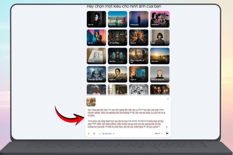 Chuẩn bị nội dung mô tả (prompt) càng chi tiết càng tốt: Ngoài phong cách, bạn có thể chuẩn bị sẵn các yếu tố như màu sắc chủ đạo, loại hoa, hiệu ứng ánh sáng, trang phục, thậm chí cả câu chữ muốn xuất hiện trên ảnh (ví dụ: “Happy Women’s Day 8/3”). Mô tả càng rõ ràng, AI càng dễ hiểu ý tưởng và cho ra kết quả ấn tượng hơn.